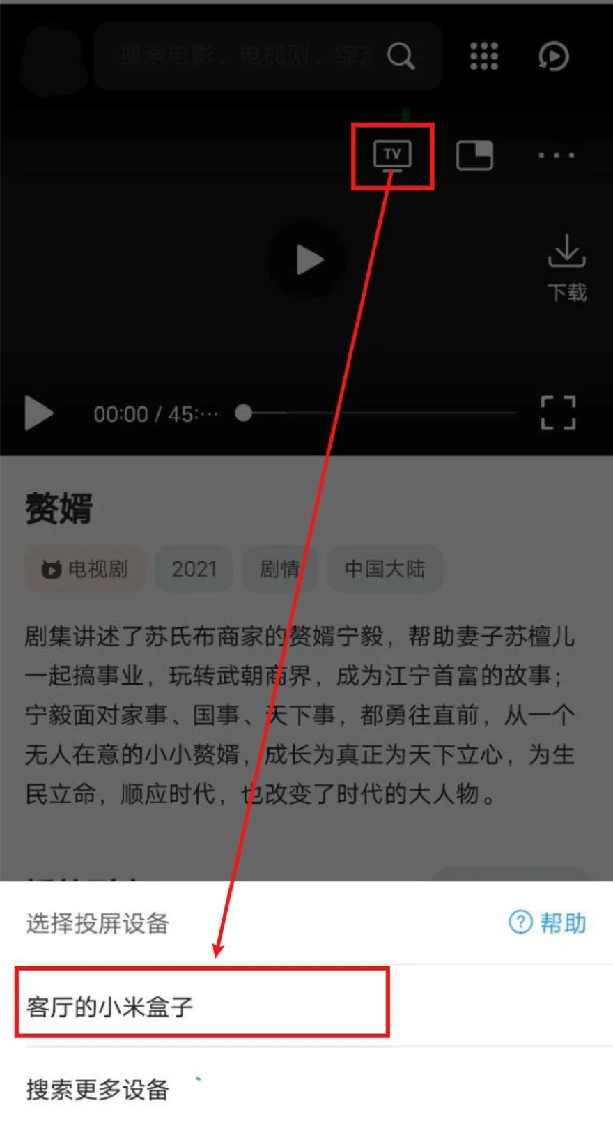 打开QQ浏览器(会接管网页播放器)->打开鸿鑫机电设备有限公司 教程视频->播放视频->选中投屏图标->等待搜寻出智能电视/电视盒子->选中,即可投屏。